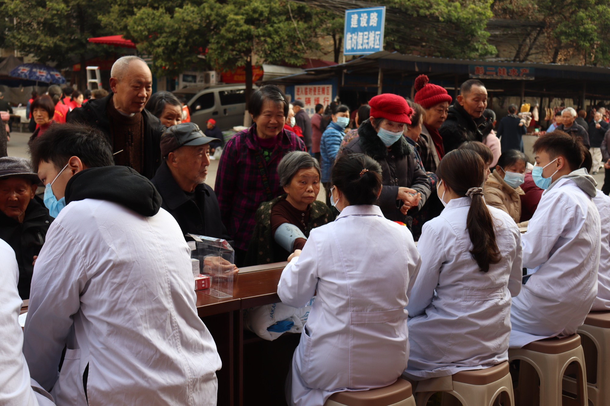志愿者们先到达现场开始搬运桌椅、搭建架台、搭横幅等准备工作。随后肿瘤科与重症医学科医生立即为社区群众测量血压、血糖,解答用药咨询以及甲型病毒预防等服务。活动现场,前来咨询的社区居民络绎不绝,场面高涨。志愿者们充分利用自身所学专业知识,向前来咨询的居民宣传防癌治癌的方法以及甲流乙流的诊断以及应对办法,分发流感预防传单给行人,为他们提供正确的就医途径。