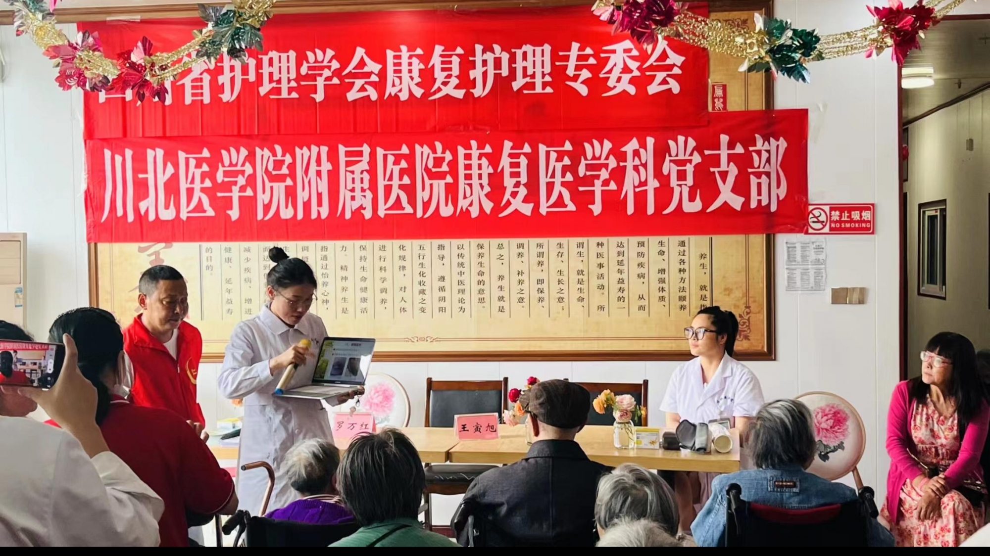 我院康复医学科专家团队和志愿者们首先为老人们进行了全面的身体检查,包括血压、血糖、心肺功能等多项指标的检测。随后,在养老院的活动室里,康复医学科副主任王寅旭作了题为“脑卒中的预防与康复”的专题宣讲,四川省护理学会康复护理专委会副主任委员、康复医学科护士长罗万红作了题为“压力性损伤的预防”主题宣讲。